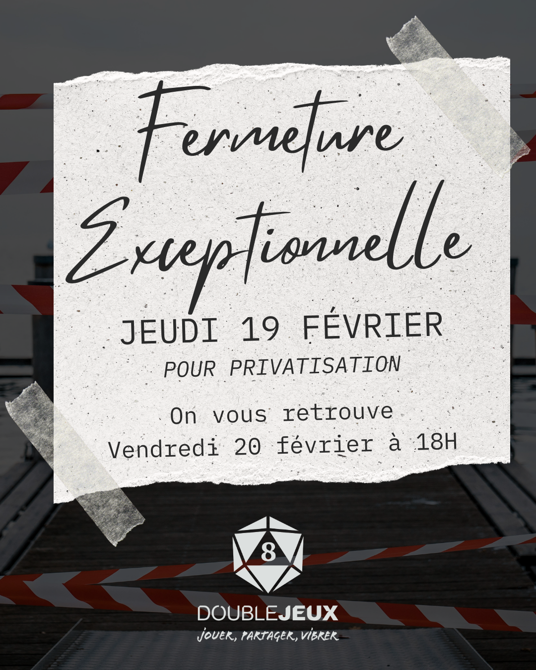 Catégories Non classé Fermeture exceptionnelle Auteur de l’article Par DoubleJeux Date de l’article 16 décembre 2025 Aucun commentaire sur Fermeture exceptionnelle Nous serons exceptionnellement fermés jeudi 19 février pour privatisation. Retrouvez nous vendredi 20 février à 18h!! ← La carte d’hiver est arrivée!!! → Fermeture congés de Noël Laisser un commentaire Annuler la réponseVotre adresse e-mail ne sera pas publiée. Les champs obligatoires sont indiqués avec *Commentaire * Nom * E-mail * Site web Enregistrer mon nom, mon e-mail et mon site dans le navigateur pour mon prochain commentaire. Δ